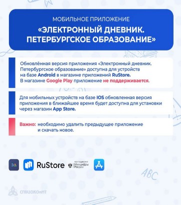 Обновлённая версия мобильного приложения «Электронный дневник. Петербургское образование» уже доступна для Android в Ru Store (в магазине Google Play приложение не поддерживается) clck.ru/3NwKzB